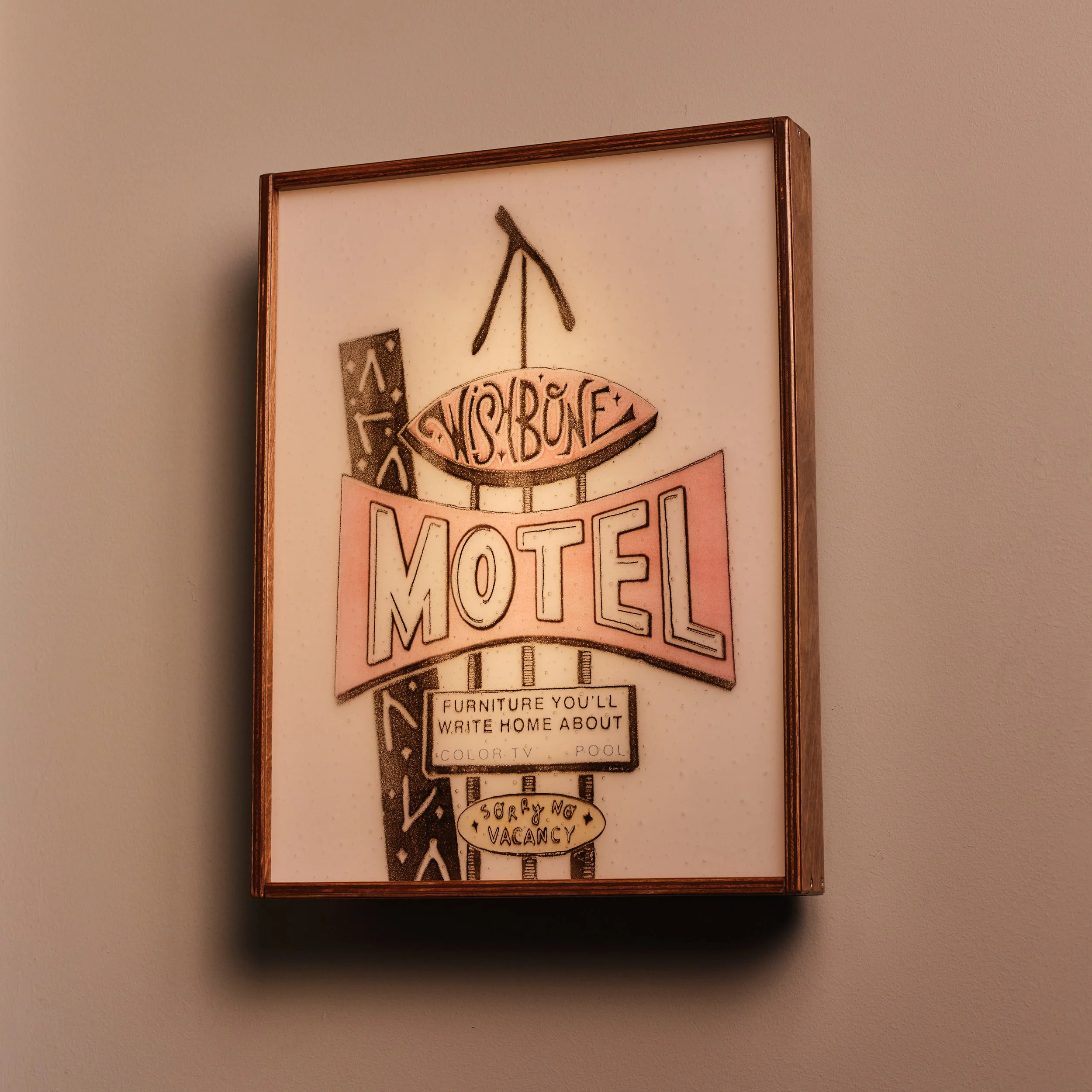 This art glass motel sign is a vacation to look at—and can be fully customized to nearly any image you can conjur. Housed in a hand kerfed wooden box, it sits on a table or can be mounted to the wall.